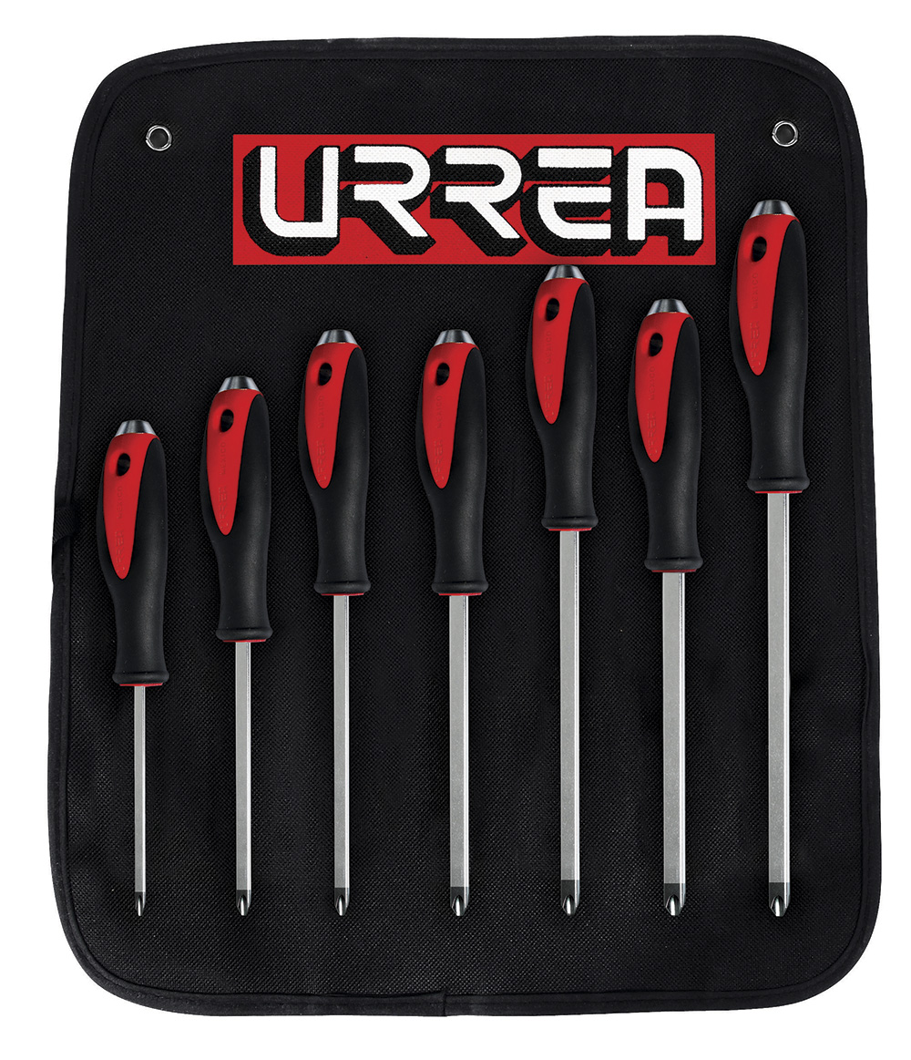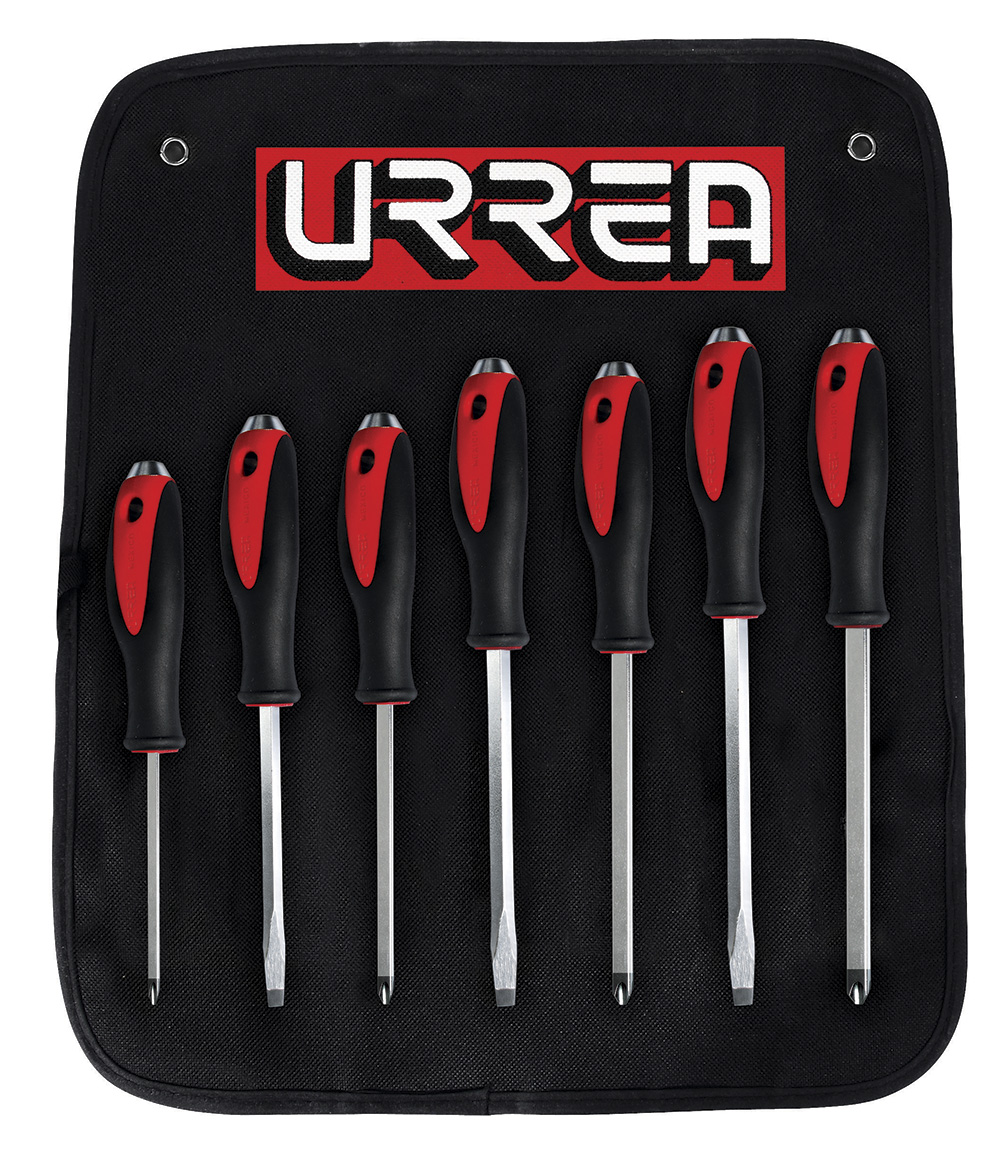 -Juego de 19 destornilladores bimaterial combinado Urrea -Juego de destornilladores Urrea BI-materiales, en estuche. 19 Piezas. -Puntas Cabinet, Phillips® y planas. -Mayor capacidad de torque por su diseño de mango trilobular. -Plástico rojo tipo PP resistente a la torsión y al impacto. Plástico negro tipo TPE de caucho suave para mejor agarre.