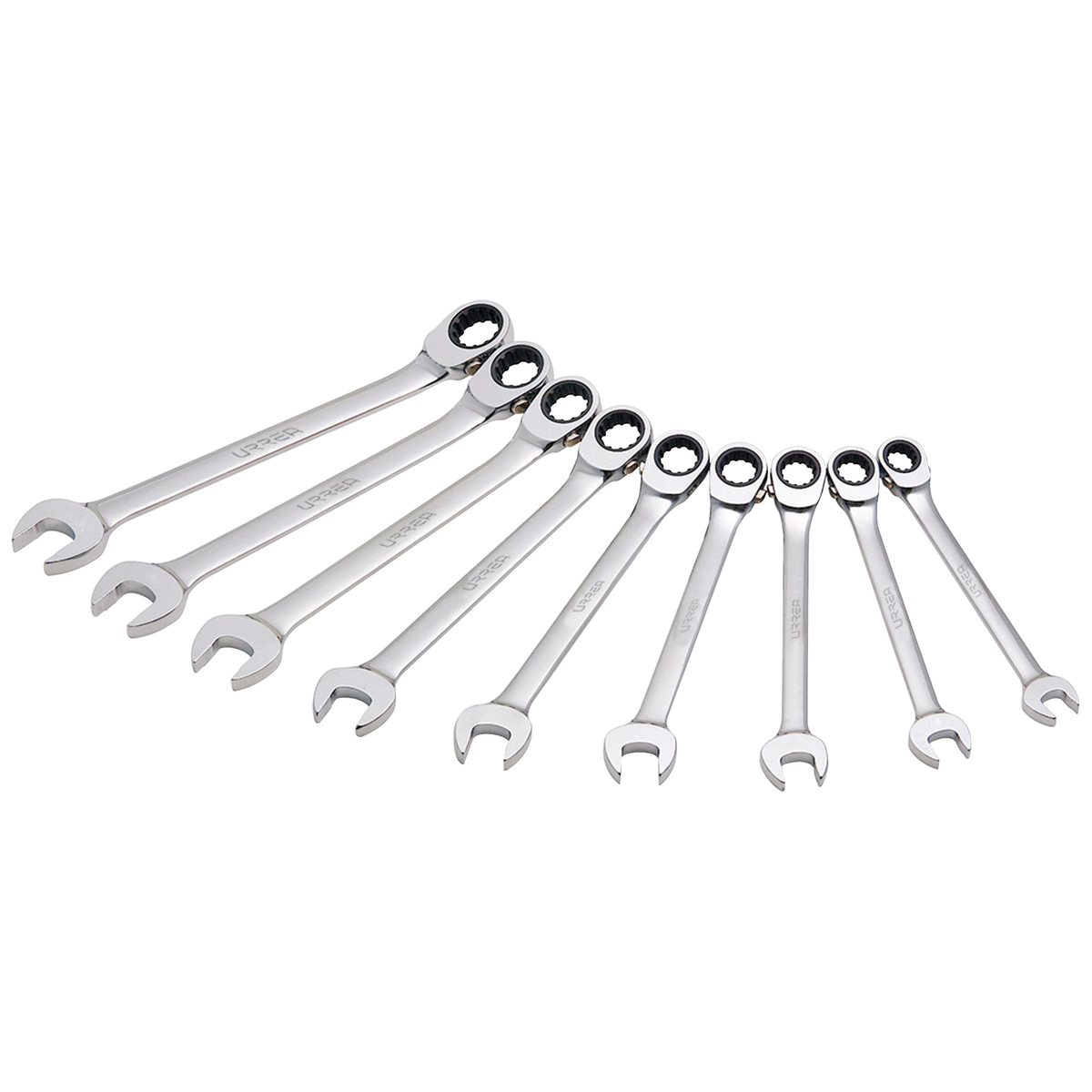 -Juego de 9 llaves de matraca reversible spline en pulgadas Urrea -Juego de llaves Urrea combinada de matraca SPLINE® reversible y llave española regular. 9 Piezas. -Cromado pulido espejo en acero Cromo-Vanadio. -Llave española regular con ángulo de compensación de 15° utilizada para apretar tuercas y tornillos. -El mecanismo de las matracas está diseñado para trabajar con tornillos con cabeza: SPLINE®,TORX®, cuadrada, 6 puntas, redonda y 12 puntas.