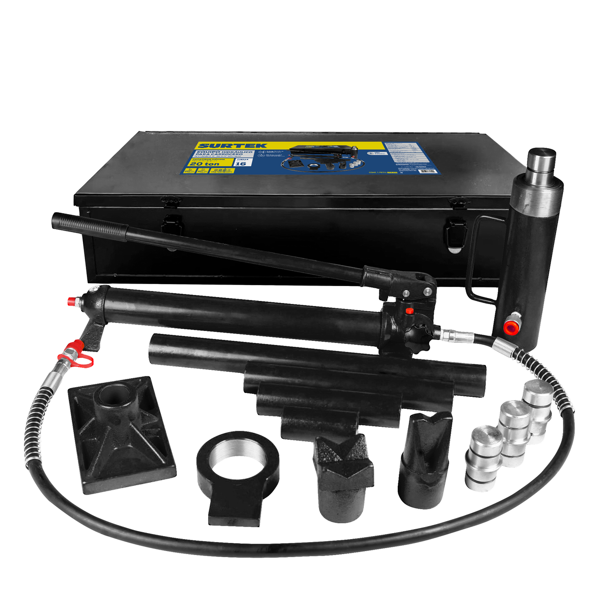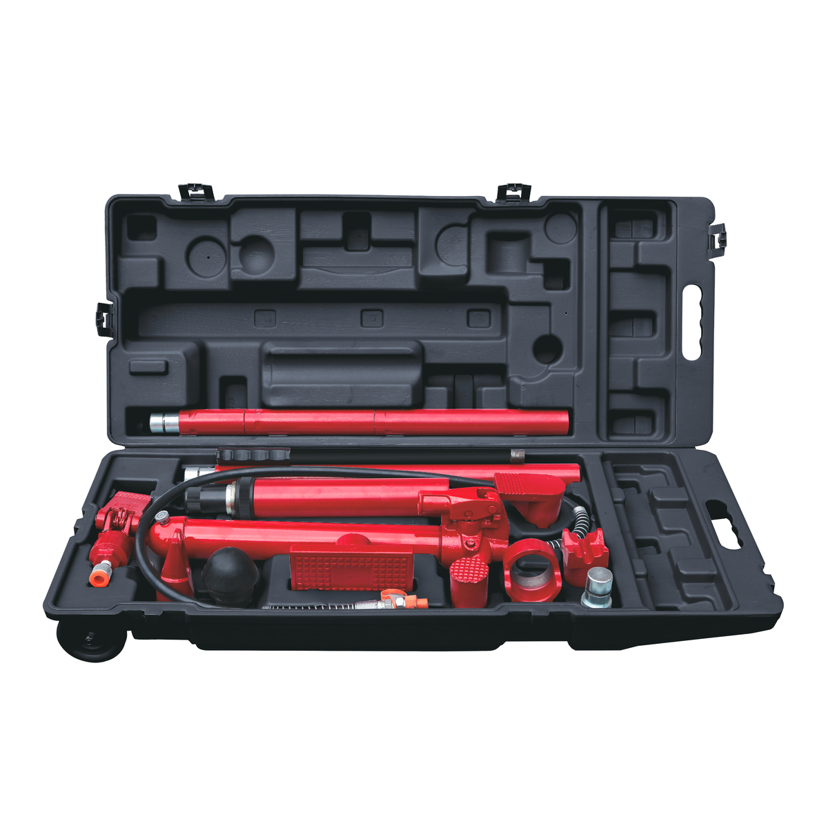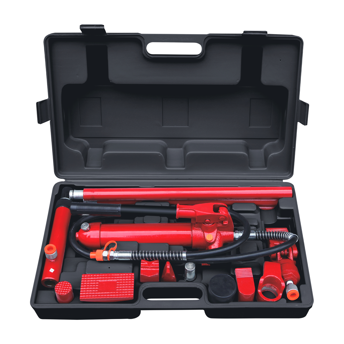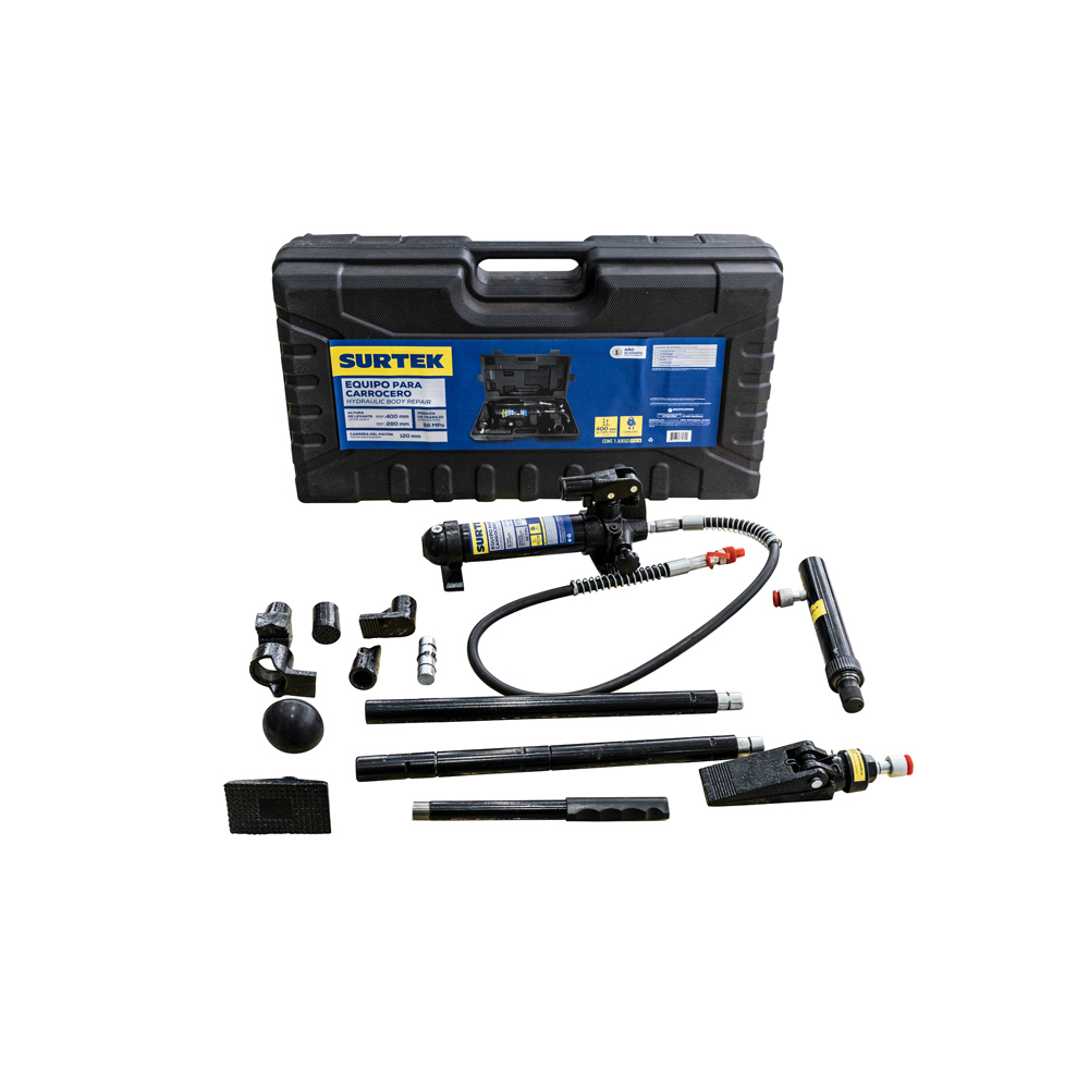 -Bomba y cilindro reforzado que alarga la vida útil del producto. -Extensiones y accesorios fabricados con hierro nodular. -Práctico estuche de plástico. -Coples de acero al carbón. -7 Accesorios de hierro nodular. -Ideales en talleres mecánicos para desabolladuras de vehículos, reparaciones de carrocerías en general, trabajos de rescate y en cualquier aplicación de empuje, separación, tracción o elevación que requiera fuerza hidráulica.