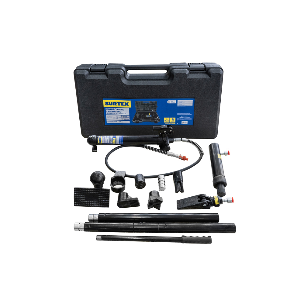 -Bomba y cilindro reforzado. Extensión y accesorios de hierro nodular. -Práctico estuche de plástico. -Capacidad máx. 10ton. Altura máx. 145mm. Presión máx. 61,62 MPA. -Válvula de seguridad contra sobrecargas. -Limitador hidráulico contra sobrecargas. -Ideal en talleres mecánicos para reparaciones de carrocerías en general.
