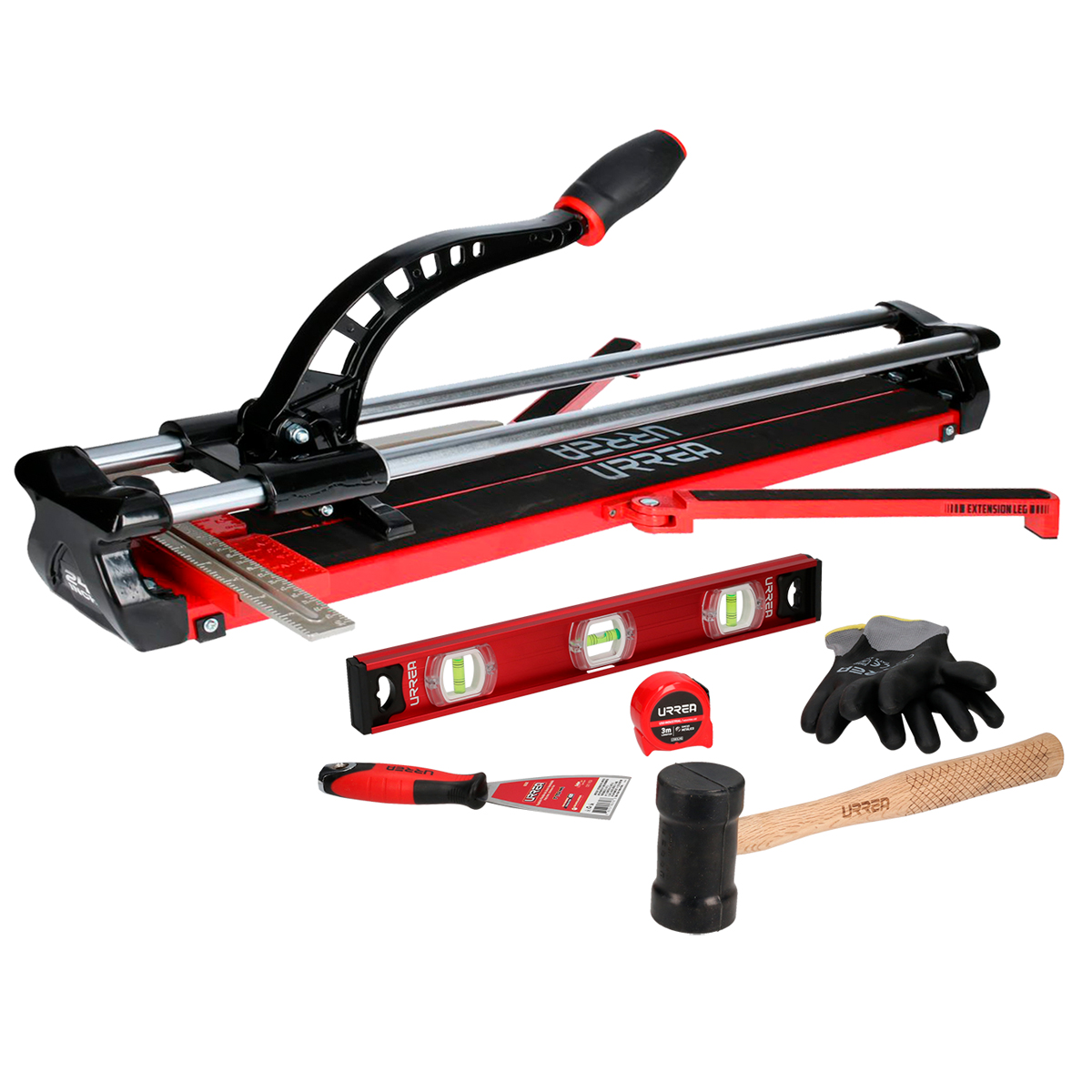 -Juego de corta azulejos de 24 pulgadas con herramientas adicionales. Mazo con cabeza cilíndrica que proporciona un área de mayor impacto. Nivel tipo torpedo precisión de 1mm/m. Espátula con casquillo para golpes ligeros. Flexómetro industrial cinta impresa por ambos lados de 3 metros y guantes de poliuretano espumoso. -Corte eficaz con menor esfuerzo gracias a su cuchilla de tungsteno. Mayor estabilidad para un corte preciso. -La herramienta que necesitas para la instalación de azulejo en un solo lugar. -Trabajos más rápidos. -Menos voluminoso que otros cortadores. Base con extensiones de aluminio para un trabajo más cómodo. -Ideal para su uso en construcción.