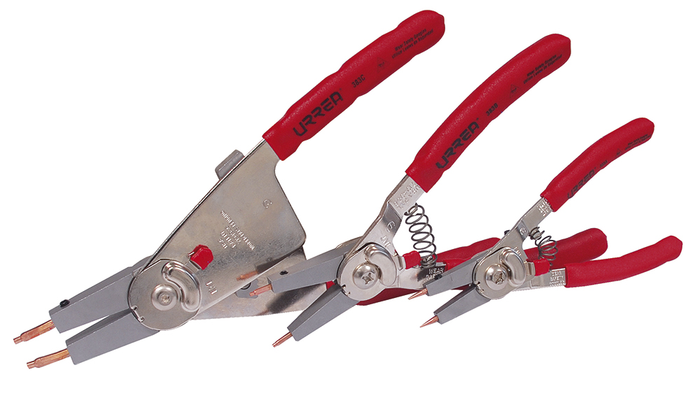 -Juego de 3 pinzas para anillos de retención uso pesado y 8 puntas Urrea -Cuenta con resorte para facilitar la apertura de la punta (383a y 383b). -Con sistema de trinquete automático para el cambio de sistema interno a externo o viceversa (383c). -En cada pinza se incluye pares de punta de acero aleado en diferentes colores, llave hexagonal y tornillos de sujeción de puntas.